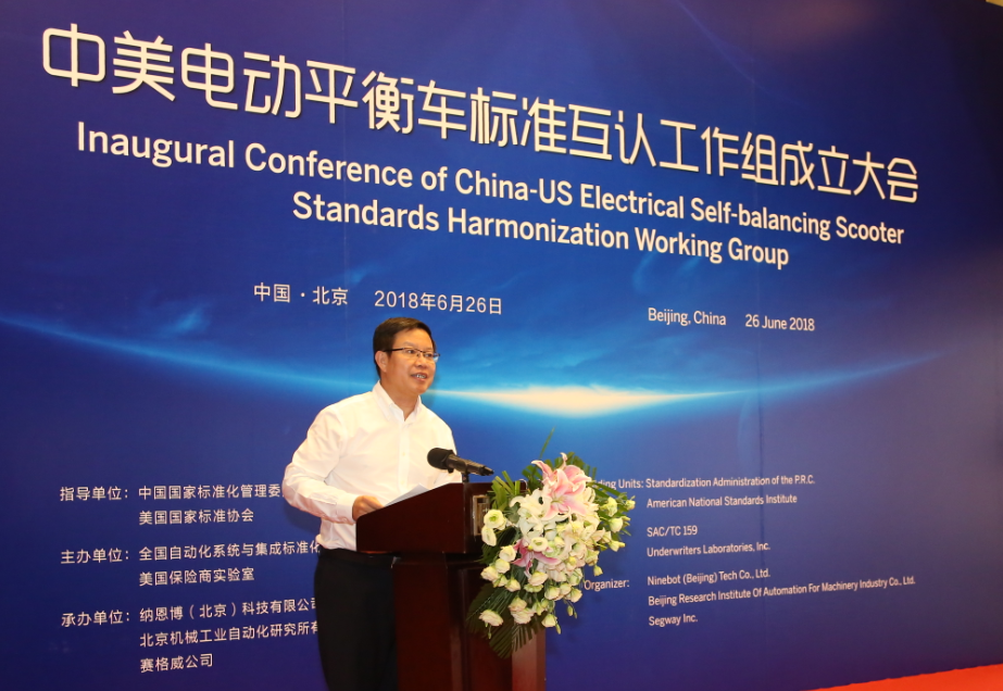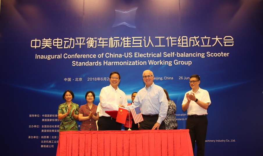 626日,中美电动平衡车标准互认工作组成立大会在北京唯实大厦成功举行。全国自动化系统与集成标准化技术委员会主任委员、机械总院集团董事长王德成与美国保险商实验室全球副总裁 Philip M.Piqueira分别代表中美双方签署电动平衡车标准互认合作协议。中国国家标准化管理委员会副主任殷明汉、IEC美国国家委员会副主席Sonya Bird、美国大使馆参赞Cynthia Griffin、北京航空航天大学教授王田苗、全国自动化系统与集成标准化技术委员会秘书长黎晓东、Segway-Ninebot公司总裁王野等领导及电动平衡车国家标准起草组专家出席会议,共同见证了中美两国标准化合作的历史时刻。